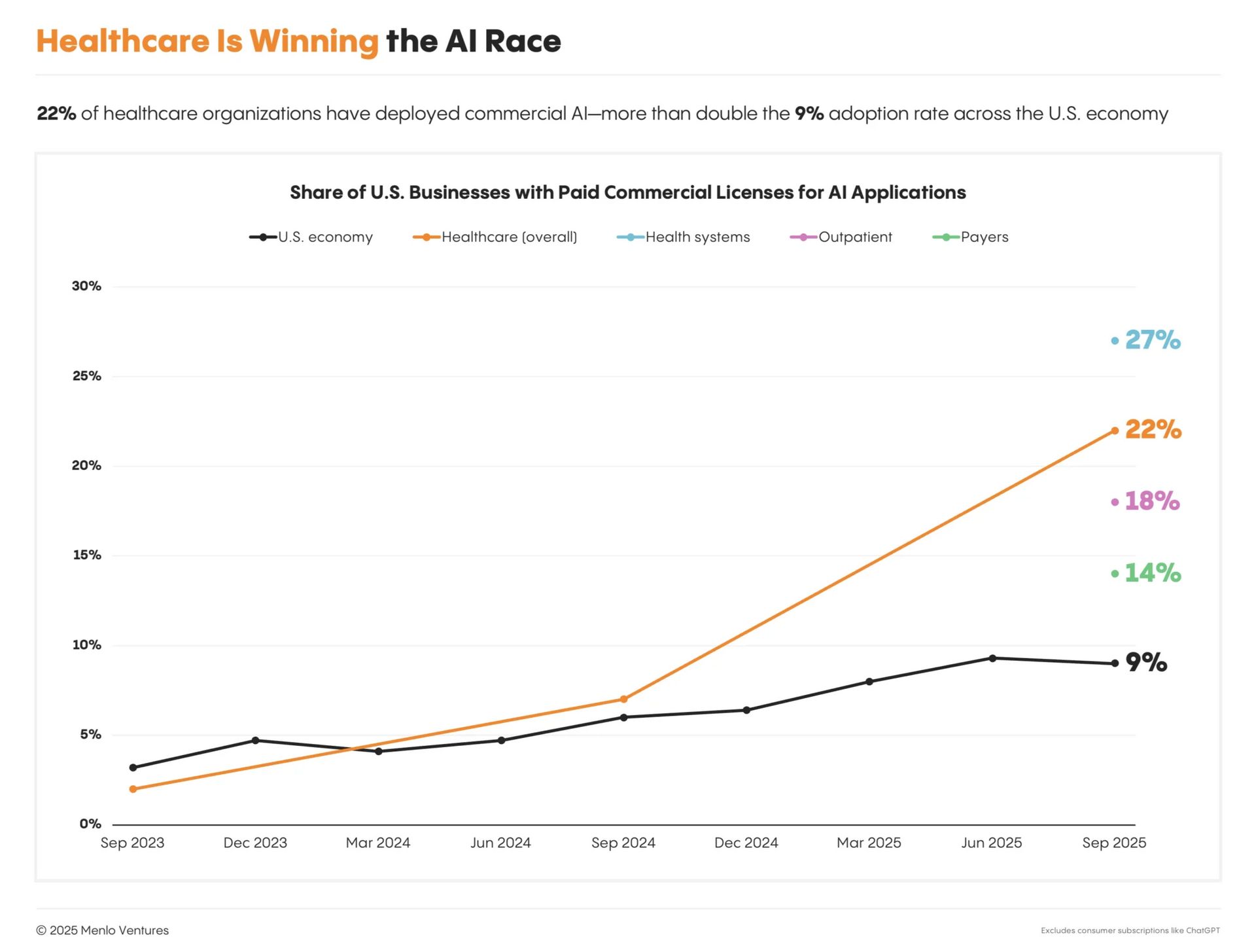 Often considered a technological laggard, the healthcare industry is a leader in adopting AI. A recent survey by VC firm Menlo Ventures indicates that 22% of healthcare organizations in the US have adopted one or more AI tools, as compared to only 9% of US businesses in general. Much of this is driven by the rapid adoption of AI Scribe tools for documenting clinical encounters, which relieves a major pain point for clinicians, but also has obvious applications for coding and billing. Now that the first wave of AI adoption for clinical documentation has begun to solidify, healthcare organizations are looking to use AI for operational efficiencies and cost saving, which may reduce administrative headcount.