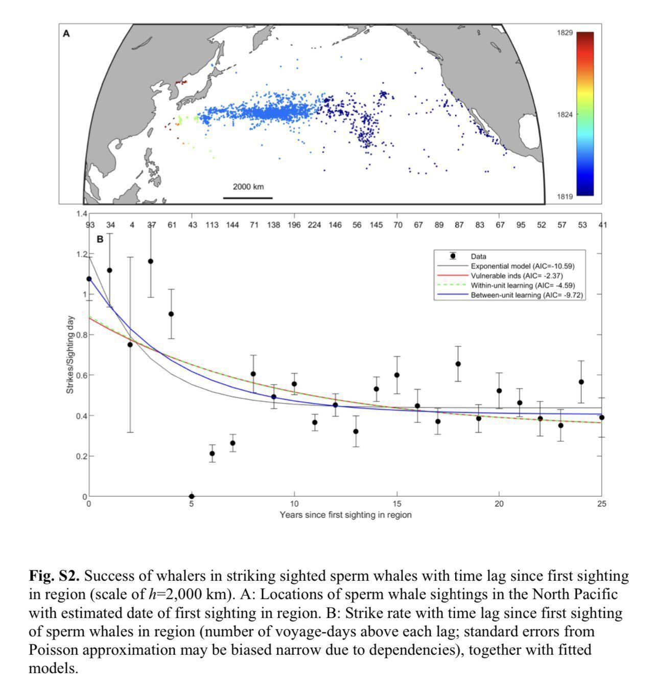 This fascinating paper looks at the rapidly declining success of sperm whale hunters in the 19th century, and concludes that sperm whales learned effective avoidance techniques, and taught it to others through their kinship networks.