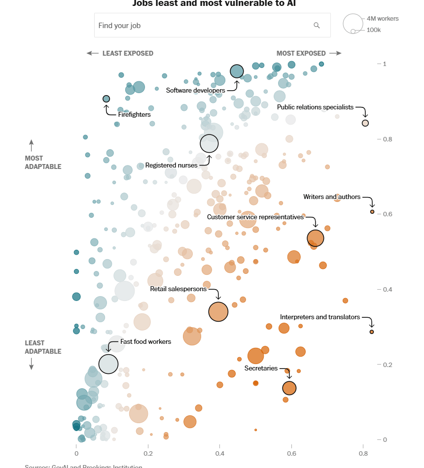 The folks at GovAI, a policy analysis organization, have estimated the exposure of over 350 job categories to automation by AI. They also estimated the potential adaptability of the holders of each job - the likelihood of displaced workers in that job finding comparable employment in another field. The result is the scatter-plot below, where the horizontal axis measures exposure to displacement by AI, and the vertical axis measures the estimated adaptability of workers in that job.