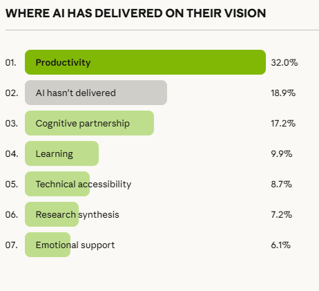 AI model-maker Anthropic just released the results of a poll of 81,000 of their users, who were asked how they used AI and what they felt about it. The major findings:
